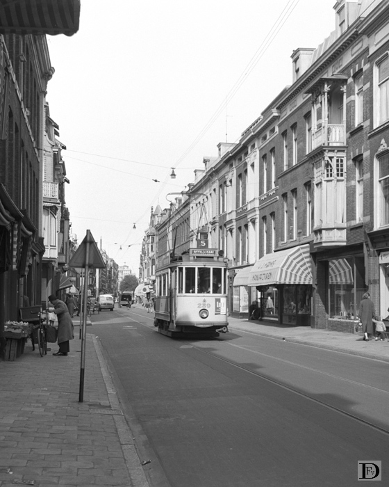 Een losse motorwagen op lijn 5 in de Piet Heinstraat. Hier rijdt de tram alleen richting Mient; terug gaat hij via Elandstraat.