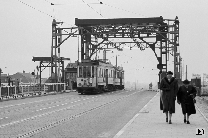 Oegstgeest, brug bij het Haagsche Schouw over de Oude Rijn in de rijksweg Den Haag - Amsterdam. Deze brug is in 1924 in opdracht van de HTM gebouwd ter vervanging van de oude brug die voor de tram ongeschikt was. Na de oplevering heeft het Rijk de brug van de HTM overgenomen.