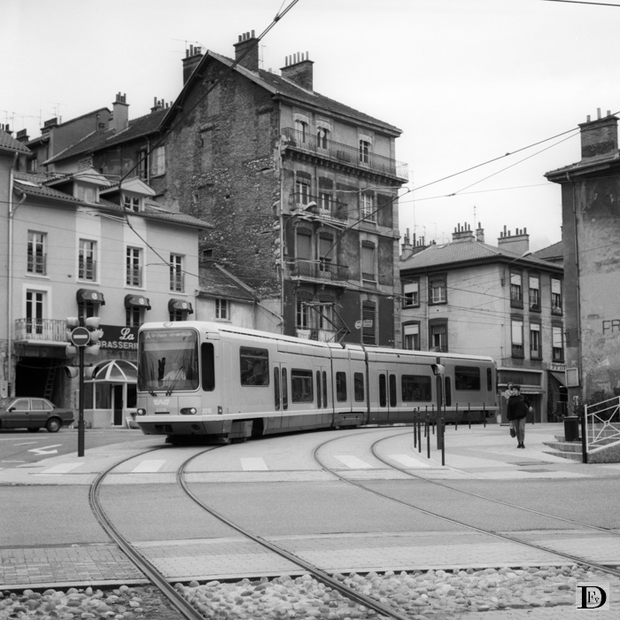 Cours Berriat bij halte Saint Bruno, de tram staat voor de boog die naar de onderdoorgang onder de spoorlijn leidt.