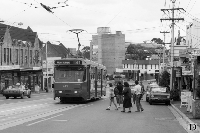 Lijn 42. Vooraan 249 met panto, op de achtergrond 233 met trolley. Beide A.