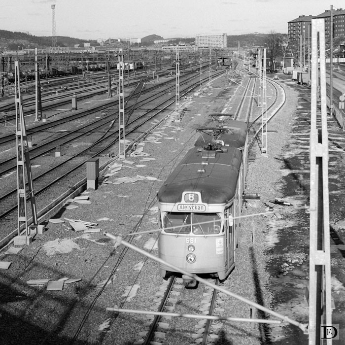 De nieuwe lijn 8, voorlopig in exploitatie tot Lärje, Alelyckan, verloopt voor wat de eerste 5 km. betreft langs de S.J. lijn waar slechts plaats voor een enkelspoor is. Achter de tram is een wisselplaats te zien, die toen deze foto werd gemaakt nog niet gebruikt werd, omdat er slechts één tramstel op en neer pendelde (in een ½ uurdienst).