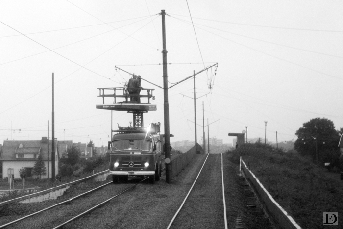 Zweden's "dagen H", een bovenleidingmontagewagen vervangt of repareert iets aan een afsluiter (lijnonderbreker) op de vrije baan van lijn 5 bij de Eketrägatan.