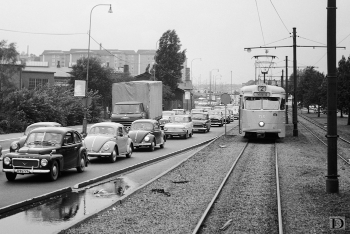 De Hjalmar Brantingsgatan met op de achtergrond de Vågmästareplats. De foto is genomen achteruit een lijn 5 op weg naar het Centraal Station. De voordelen verbonden aan een vrije trambaan blijken wel duidelijk hier! De lijn 2 bestaat uit 716 + (M 25).