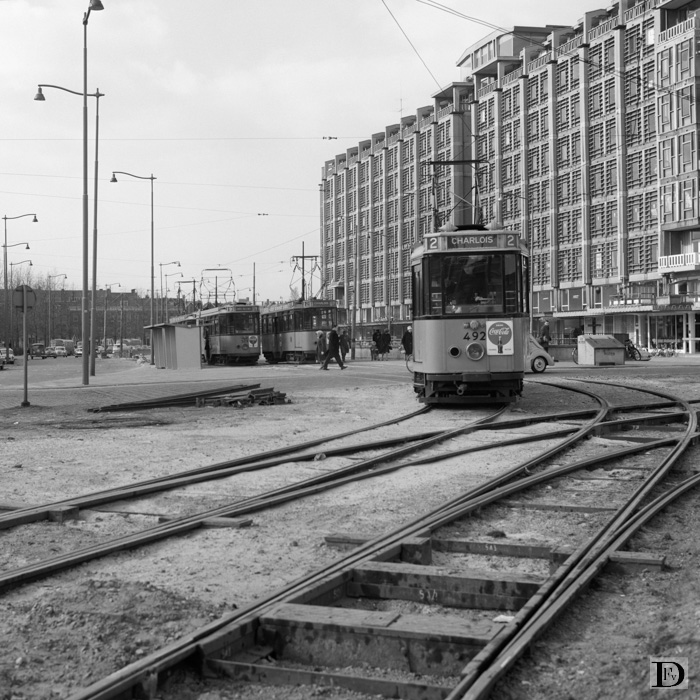 Weena bij Stationsplein met emr. 492 op lijn 2, die van het tijdelijke eindpunt van lijn 2 en 9 op het Weena tussen Bouwcentrum en Groothandelsgebouw komt. Op de achtergrond aan het eindpunt emr. 509 op lijn 9 en nog een lijn 2, emr. 499.