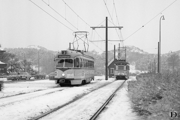 De Kwartellaan met PCC-car 1225 zojuist vertrokken van het beginpunt en PCC-car 1230 aan de eindhalte, beide uiteraard op lijn 3.