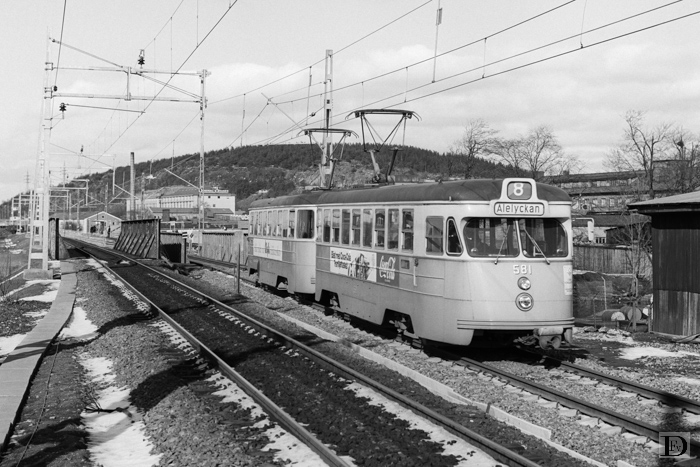 Lijn 8, nog slechts in exploitatie tussen Polhemsplatsen (Göteborg C.S.) en Lärje, Alelyckan. Op de achtergrond, voorbij de brug, bevindt zich het enige tussenstation, Gamlestadstorget. De tram beschikt hier slechts over een enkel spoor, het linker spoor is van S. J.