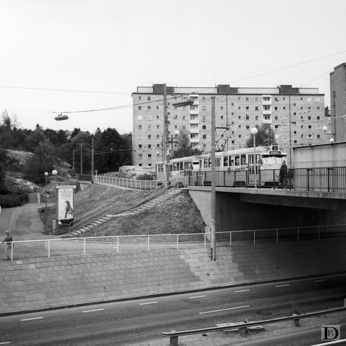 Marklandsgatan met een tramstel van lijn 1, bestaande uit twee motorrijtuigen type M 28 richting centrum - Vidkärr.