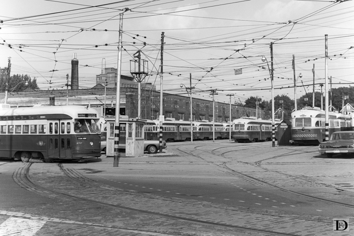 Links PCC 4707 die rond rijdt om naar de uitgang van het terrein te gaan. Verder een aantal opgestelde PCC cars.