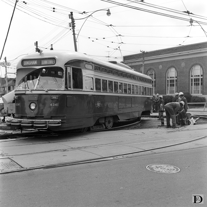 PCC 4341 (type A 6, 1948) rijdt Russell car house langs Queen Street East uit. De tram verlaat de remise hier via Connaught Ave.