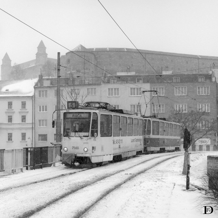 Kapucínska ul. in de oude stad met links boven Bratislavský hrad (de burcht van Bratislava). De tram rijdt op het viaductover de Staromestská ul.