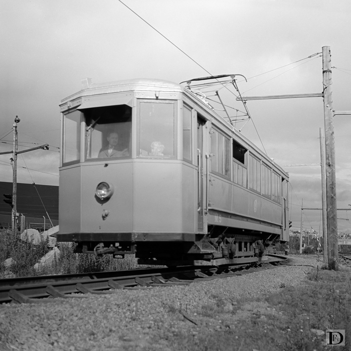 M 5 tussen het SJ-viaduct bij de Övägen en de Kiirunavaara. Let op de houten bovenleidingmasten. Het spoor uiterst recht is Statens Järnvag (spoorwegen)!