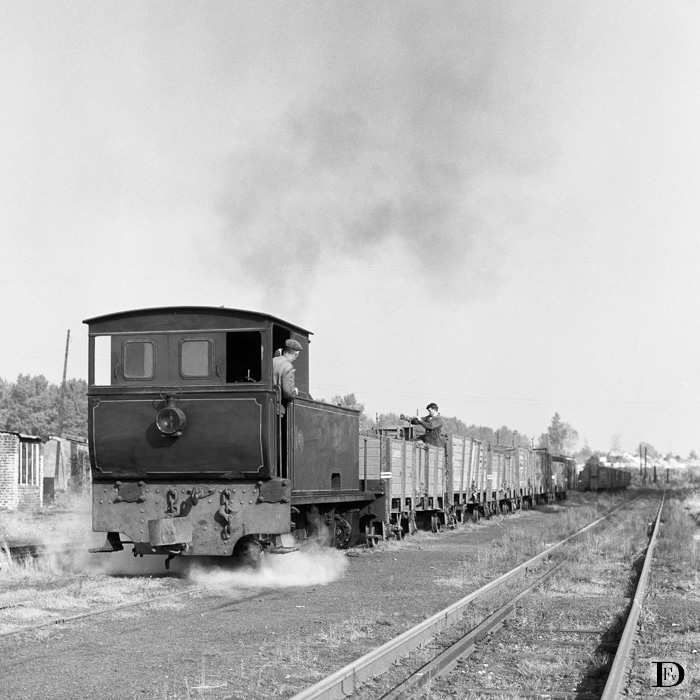 Spoorweg Raffinerie Tirlemontoise. Loc "Tongres" van de R.T. met goederenwagens van de NMVB op het overname- emplacement tussen beide bedrijven. Vrijdag 13 oktober 1961.