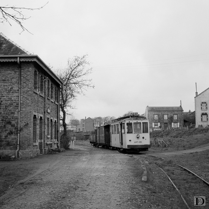 Buurtspoorwegstation Maissin aan de lijn Pussemagne - Bouillon - Paliseul - Poix - St. Hubert. ART 135 trekt een oud personenrijtuig en een open goederenwagen die tot sproeitrein zijn omgebouwd.