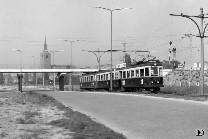 Leiden, de Blauwe Tram naar Den Haag gaat bij NS halte Lammeschans onder de spoorlijn naar Woerden door.