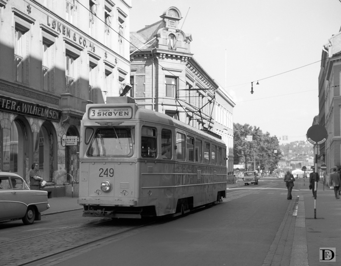 Høka vogn (Hønevoss Karosseri- og Jernbanevognfabrikk, Hø-Ka), serie 204 - 260 (eigenlijk deel serie 254 - 260) uit 1953. Boven de voorruit de "fabrieksvleugel". De 204 - 233 hadden die vleugel onder de voorruit. In de jaren zestig verdwenen de vleugels bij grote revisie, maar ze werden na herroeping van het opheffingsbesluit, toen er weer meer zorg aan de trams werd besteed, geleidelijk weer aangebracht.