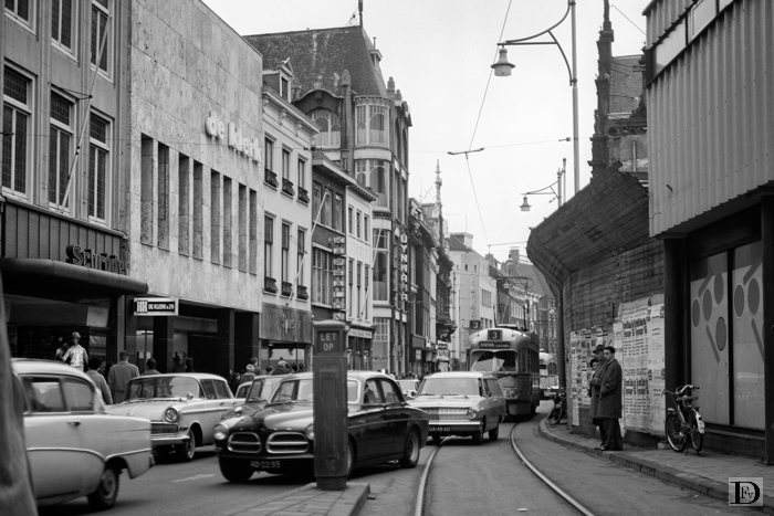Groenmarkt met PCC-car 1192 op lijn 3, die niet aan de halte kan komen door op de tramrails wachtende auto's. Er achter nog een andere PCC-car op lijn 3.