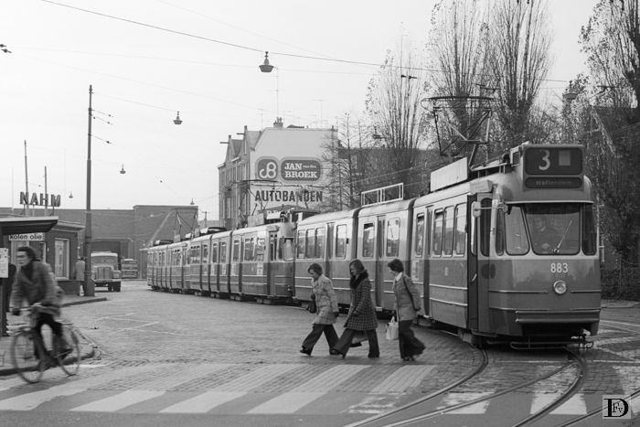Drie extra trams die klaar staan voor de afvoer van het voetbalminnend publiek uit het uitverkochte Olympisch Stadion tijdens een autoloze zondag. De overige 47 extra trams stonden in de onmiddellijke omgeving!