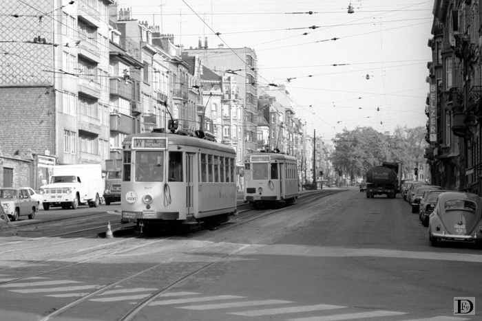 Brussel, Boulevard du Jubilé vanaf de Boulevard Leopold II met twee trams richting Place Rogier. Voorop emr (N) 10.477 op lijn W uit Wemmel, daarachter een lijn S uit Strombeek het Voor.