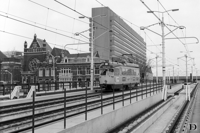 Tramviaduct tussen CS (achtergrond) en Kalvermarkt. Links naast de tram de Oranje Buitensingel.
