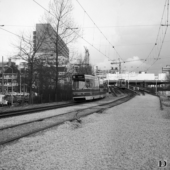 Lijn 6 onderaan het viaduct van C.S., langs de Muzenstraat. De foto is genomen tijdens de ombouw van de sporen i.v.m. de aanleg van de trambaan voor lijn 1 en 9 door het Forum gebied.