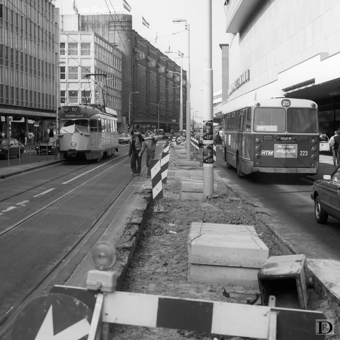 De aanleg van de halte voor het warenhuis Vroom en Dreesmann in de Grote Marktstraat.